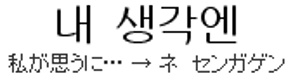 似ている表現で“내가 보기엔 ”または“내 보기엔”「私が見るに」、“내가 느끼기엔”「私が感じるに」という言い方があります。