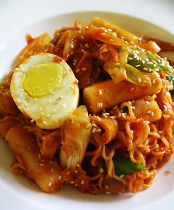 トッポッキ(うるち米で作った餅を野菜などと炒めたもの)に即席麺を加えたもの。トッポッキの最初の文字を、ラミョン(韓国語でラーメンの意)のラにかえてラポッキと呼ぶ。トッポッキと同様にカレトク、またはヒントクと呼ばれるうるち米で作った棒状の餅を、野菜などとともに甘辛く炒め、インスタントラーメンの麺を入れて作る。野菜にはタマネギ、ニンジン、長ネギなどを用い、味付けにはコチュジャン、粉唐辛子、砂糖などを用いる。具にはギョウザ、ゆで卵、おでん(おでんに入る練り製品のこと)などを加えてもよい。トッポッキの応用メニューとして、トッポッキの専門店、食堂、粉食店、屋台などでメニューに並ぶ。